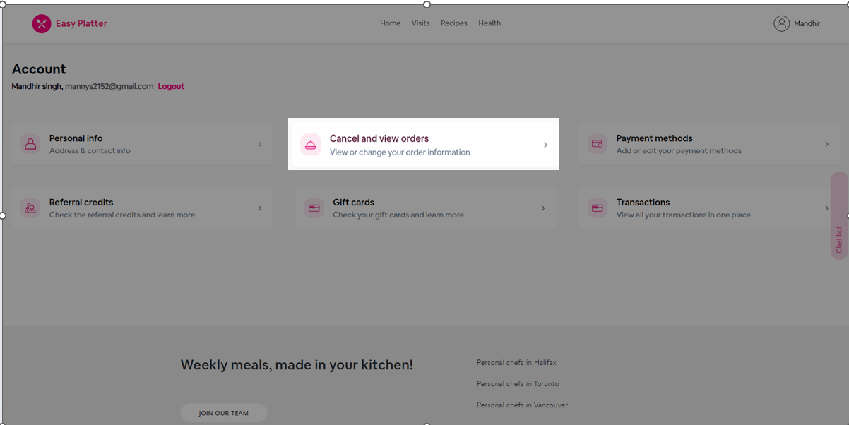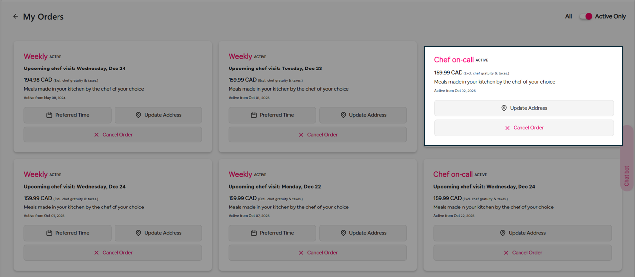 Under Orders, select the “Chef on Call” booking you’d like to add additional meal preps to.