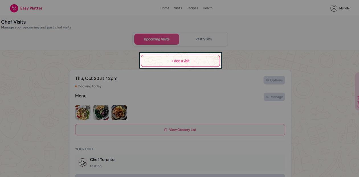 In the “Add a visit” page, you can select your preferred chef from the dropdown menu and choose the date you would like to book for your visit.